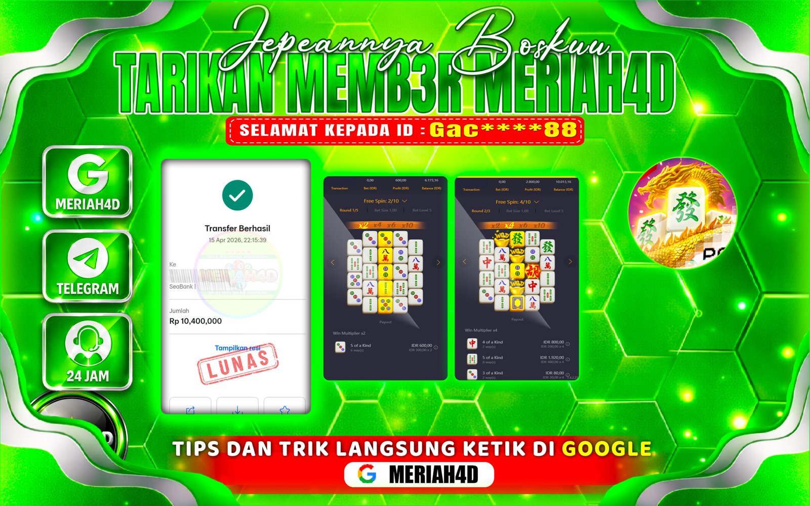 Selamat Kepada ID : Gac*****88 Atas Withdraw Rp. 10.400.000 Juta Hari ini. Ditunggu Withdraw Selanjutnya dan ajak juga teman temannya bergabung di Meriah4d