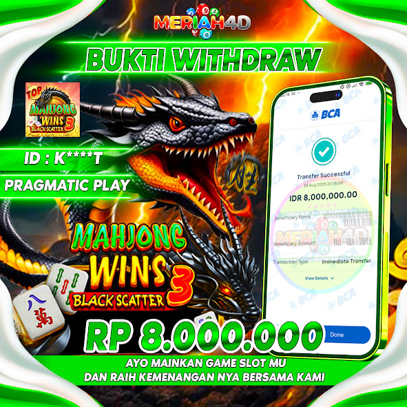 Selamat Kepada ID : K****T Atas Withdraw Rp. 8.000.000 Juta Hari ini. Ditunggu Withdraw Selanjutnya dan ajak juga teman temannya bergabung di Meriah4d