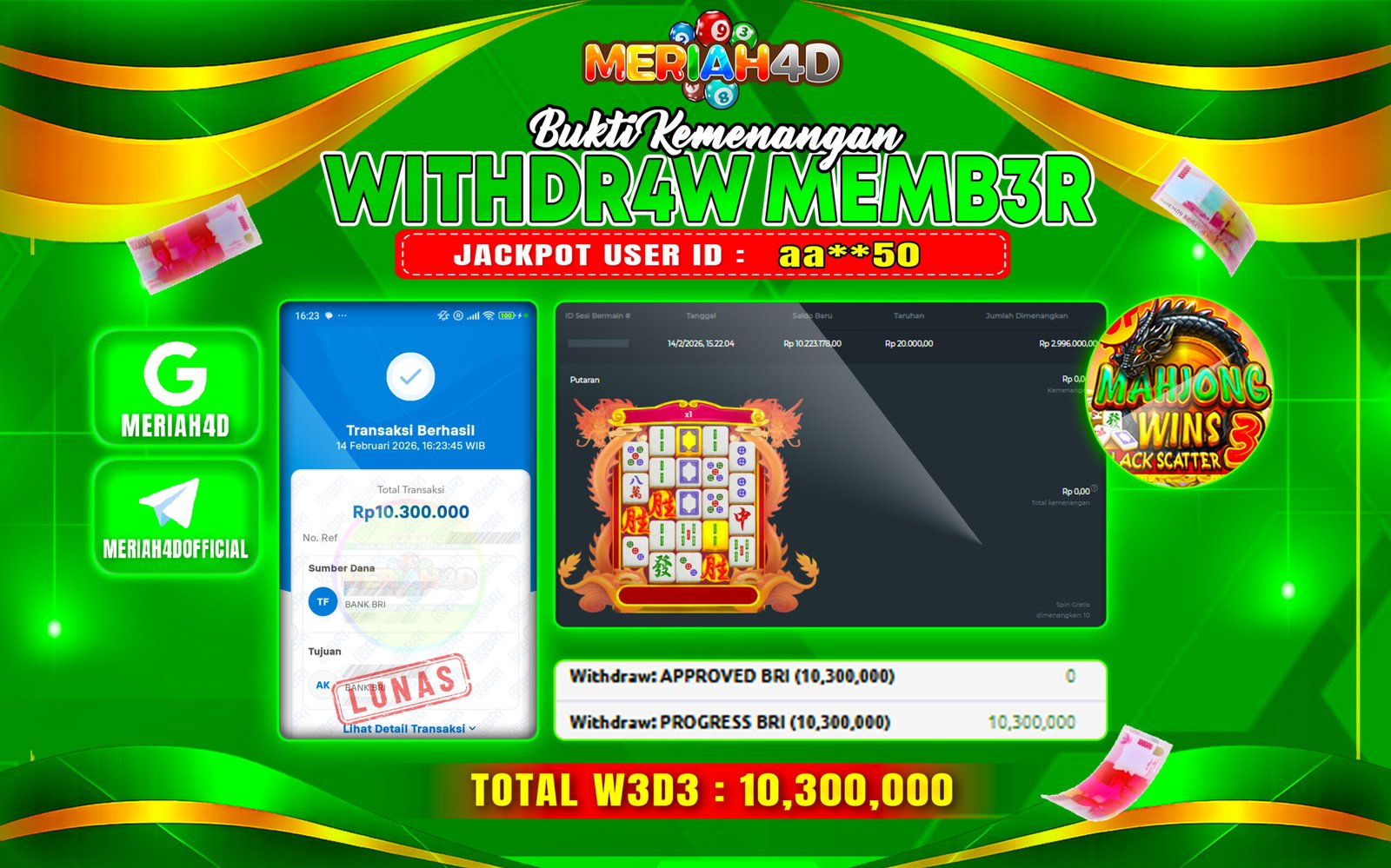 Selamat Kepada ID : AA**50 Atas Withdraw Rp. 10.300.000 Juta Hari ini. Ditunggu Withdraw Selanjutnya dan ajak juga teman temannya bergabung di Meriah4d