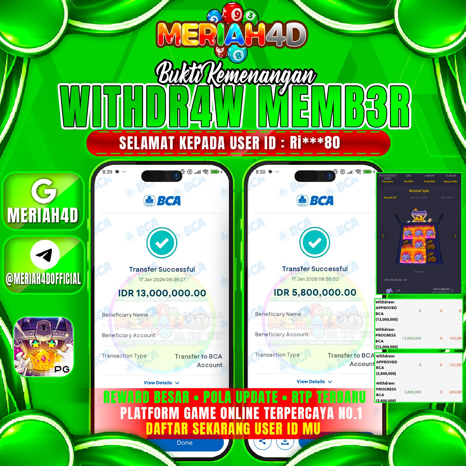 Selamat Kepada ID : RI******80 Atas Withdraw Rp. 18.800.000 Juta Hari ini. Ditunggu Withdraw Selanjutnya dan ajak juga teman temannya bergabung di Meriah4d