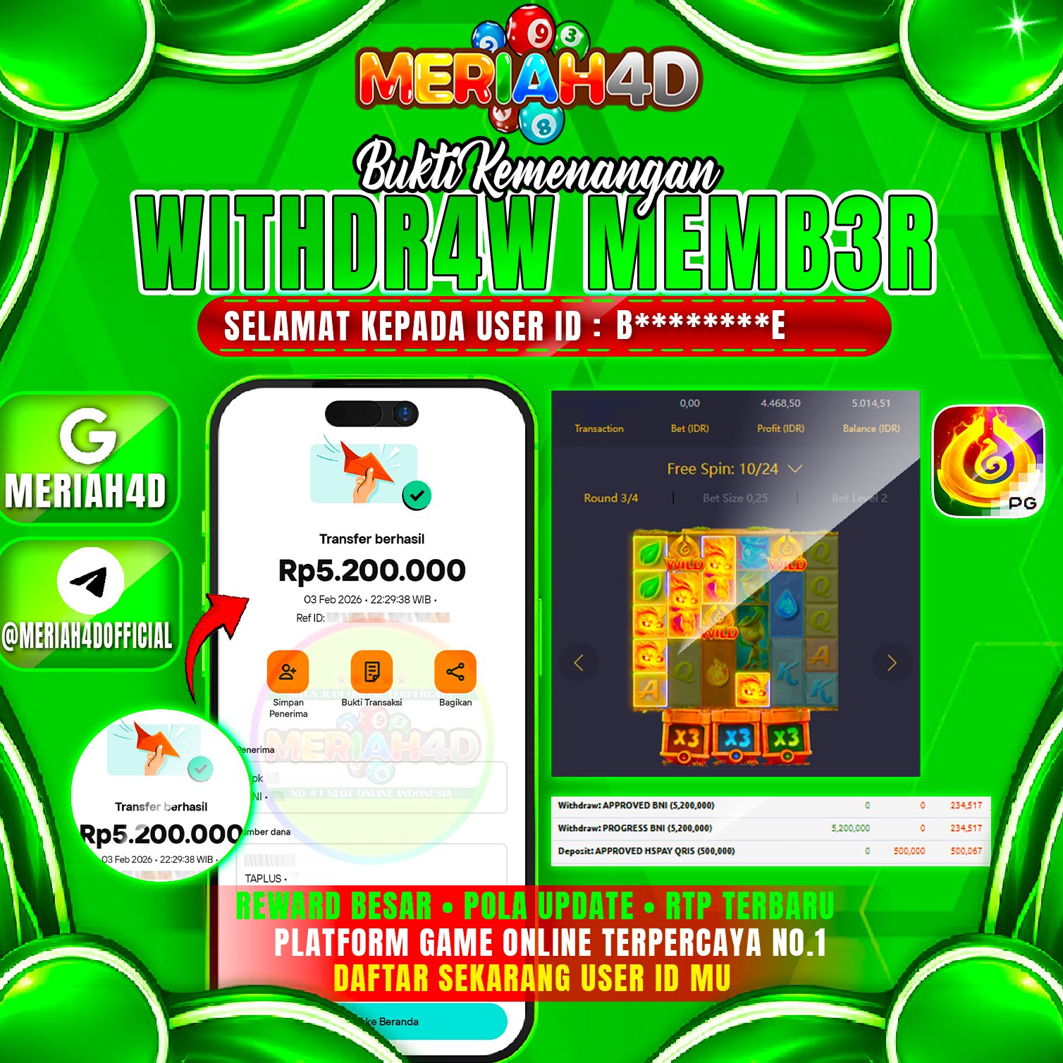 Selamat Kepada ID : B*******E Atas Withdraw Rp. 5.200.000 Juta Hari ini. Ditunggu Withdraw Selanjutnya dan ajak juga teman temannya bergabung di Meriah4d