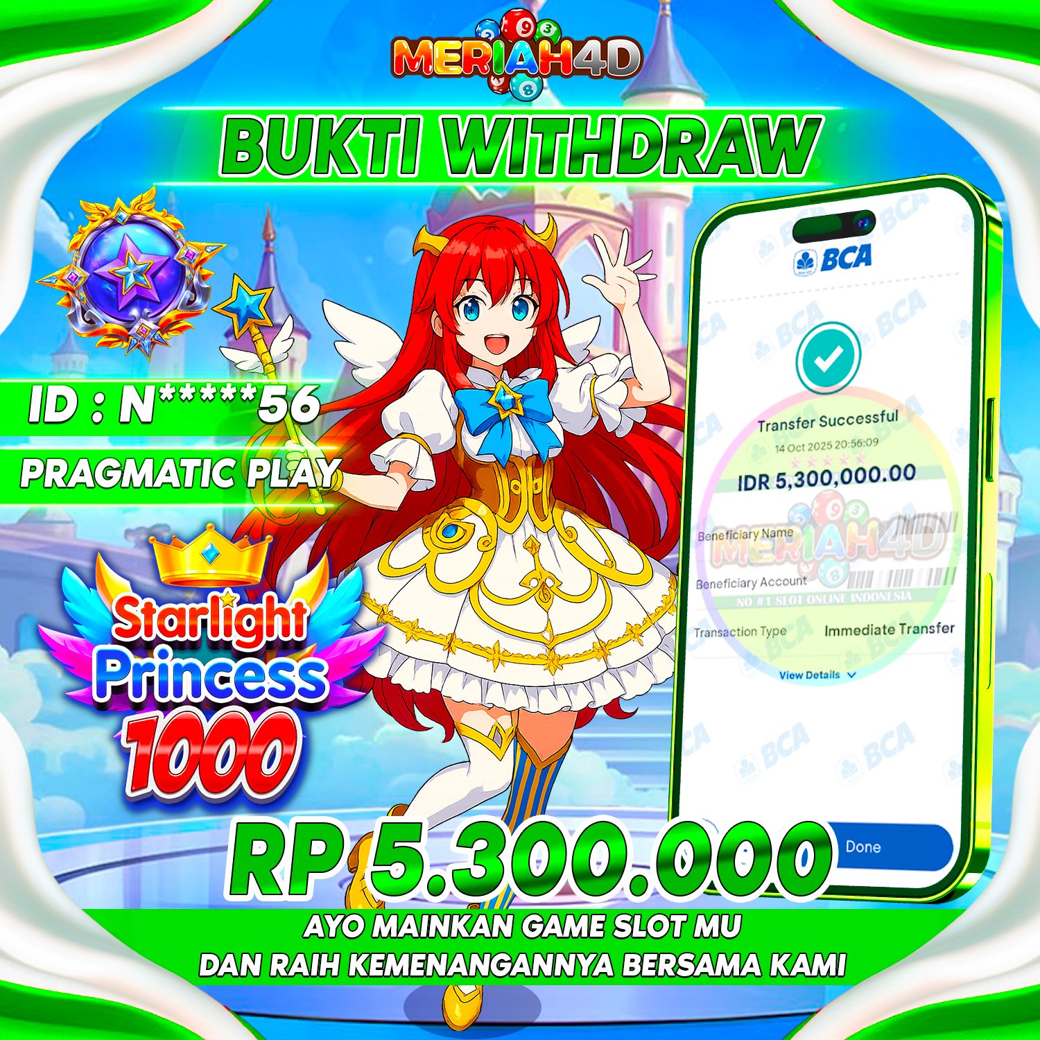 Selamat Kepada ID : N*****56 Atas Withdraw Rp. 5.300.000 Juta Hari ini. Ditunggu Withdraw Selanjutnya dan ajak juga teman temannya bergabung di Meriah4d
