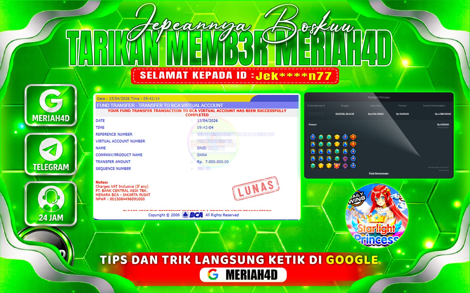 Selamat Kepada ID : Jek****n77 Atas Withdraw Rp. 7.000.000 Juta Hari ini. Ditunggu Withdraw Selanjutnya dan ajak juga teman temannya bergabung di Meriah4d