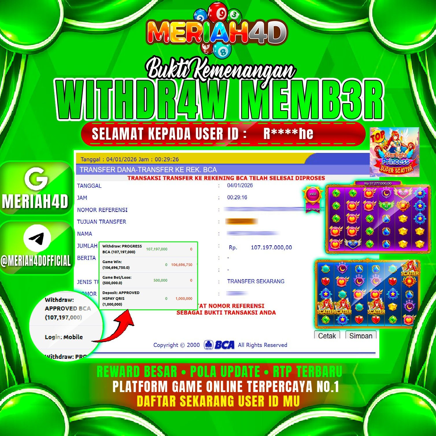 Selamat Kepada ID : R******HE Atas Withdraw Rp. 107.197.000 Juta Hari ini. Ditunggu Withdraw Selanjutnya dan ajak juga teman temannya bergabung di Meriah4d