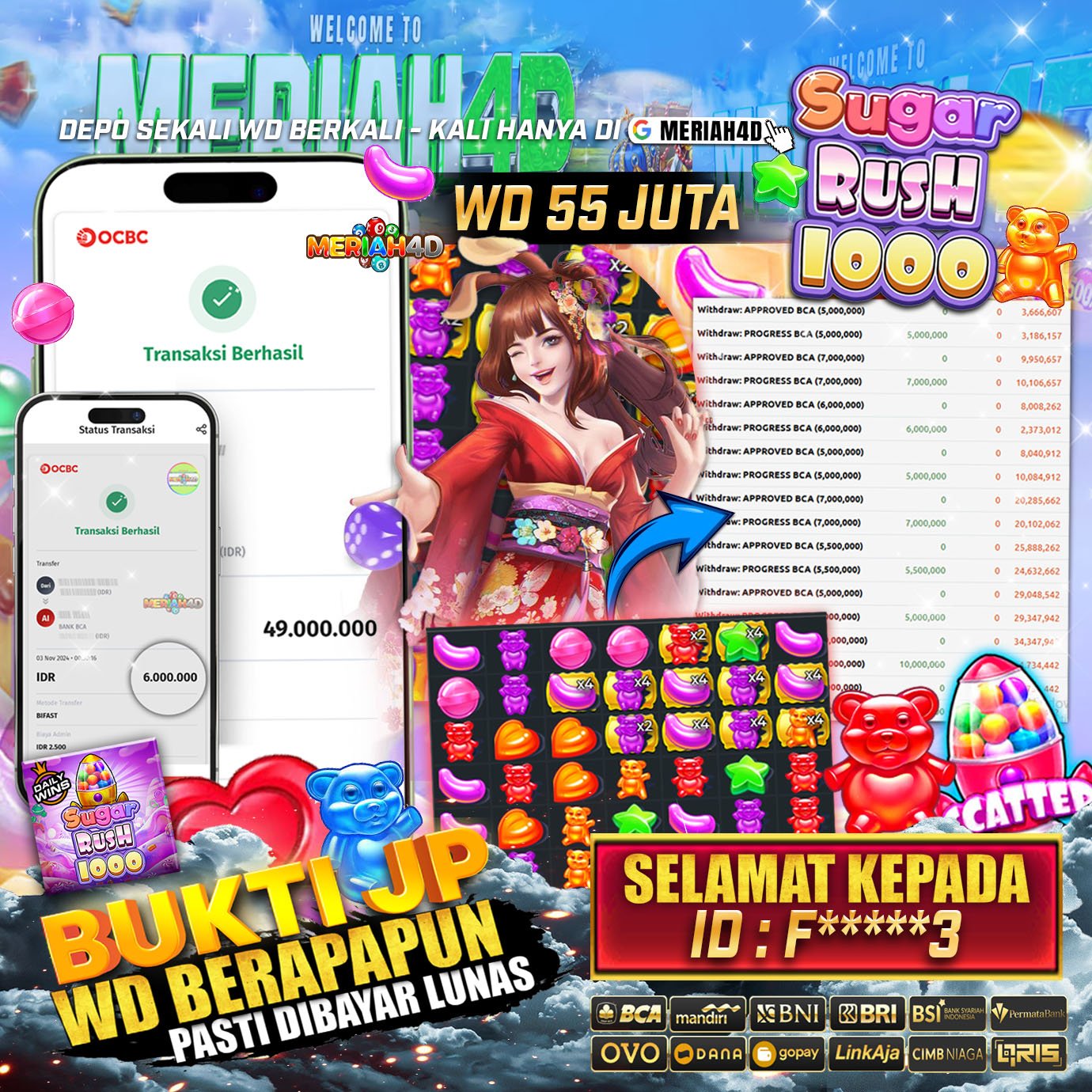 Selamat Kepada Id : F******3 Atas Withdraw Rp. 55.000.000 Juta Hari ini. Ditunggu Withdraw Selanjutnya dan ajak juga teman temannya bergabung di Meriah4d