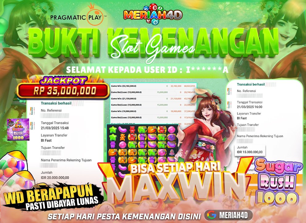 Selamat Kepada ID : I*****A Atas Withdraw Rp. 35,000,000 Juta Hari ini. Ditunggu Withdraw Selanjutnya dan ajak juga teman temannya bergabung di Meriah4d