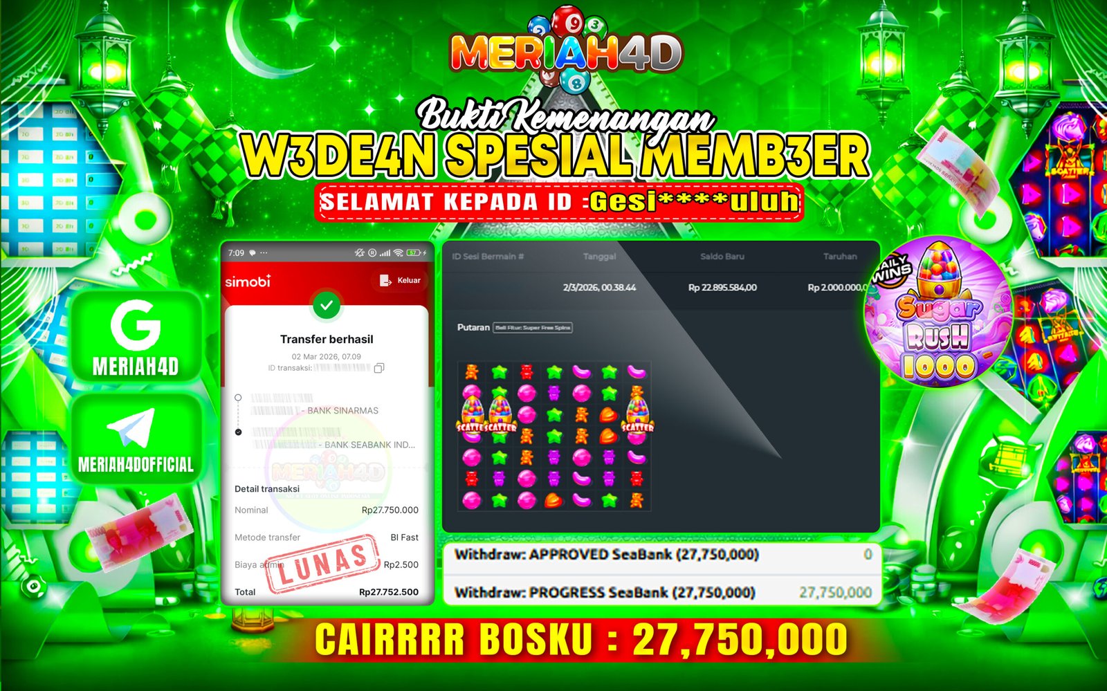 Selamat Kepada ID : GESI****ULUH Atas Withdraw Rp. 27.7500.000 Juta Hari ini. Ditunggu Withdraw Selanjutnya dan ajak juga teman temannya bergabung di Meriah4d