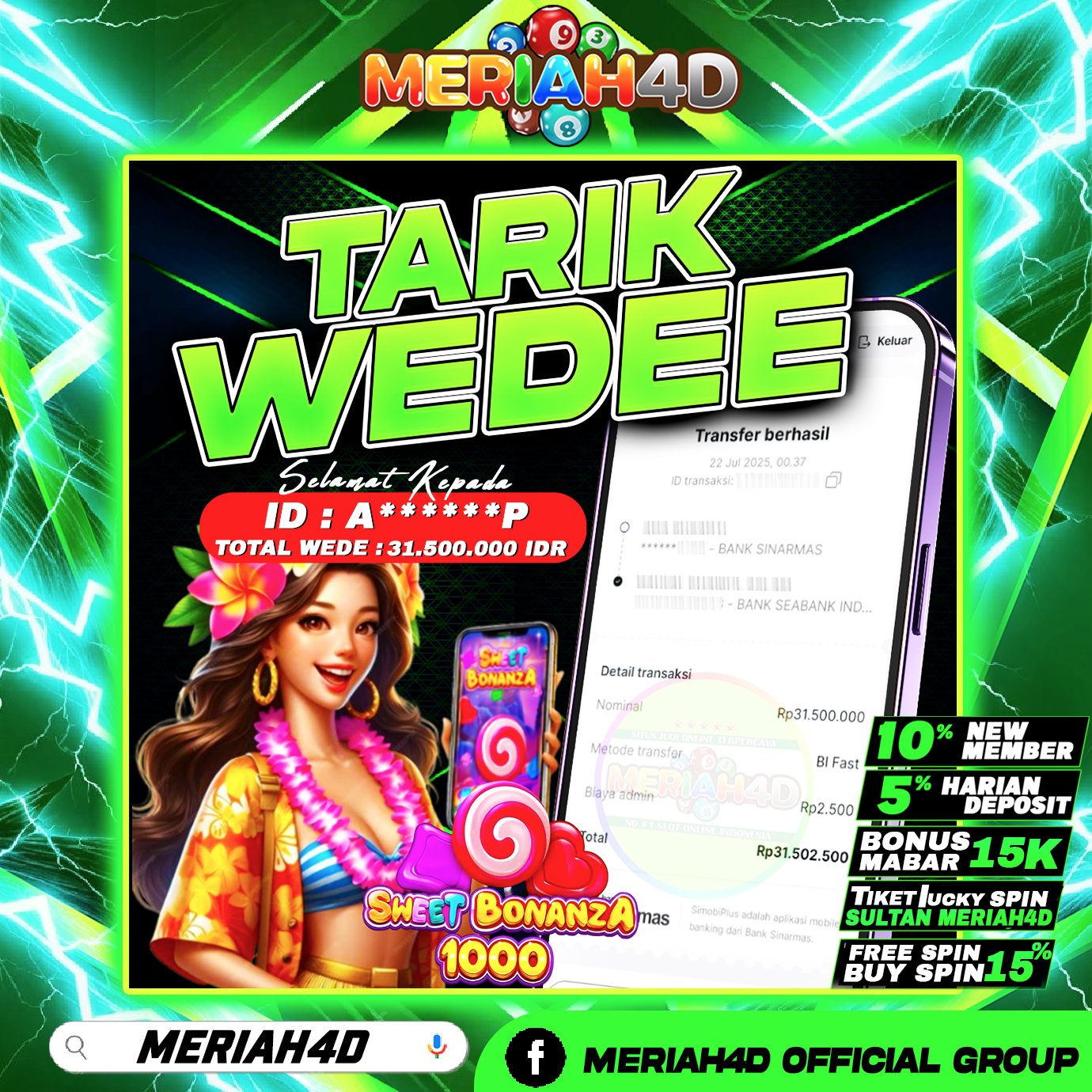 Selamat Kepada ID : A*****P Atas Withdraw Rp. 31.500.000 Juta Hari ini. Ditunggu Withdraw Selanjutnya dan ajak juga teman temannya bergabung di Meriah4d