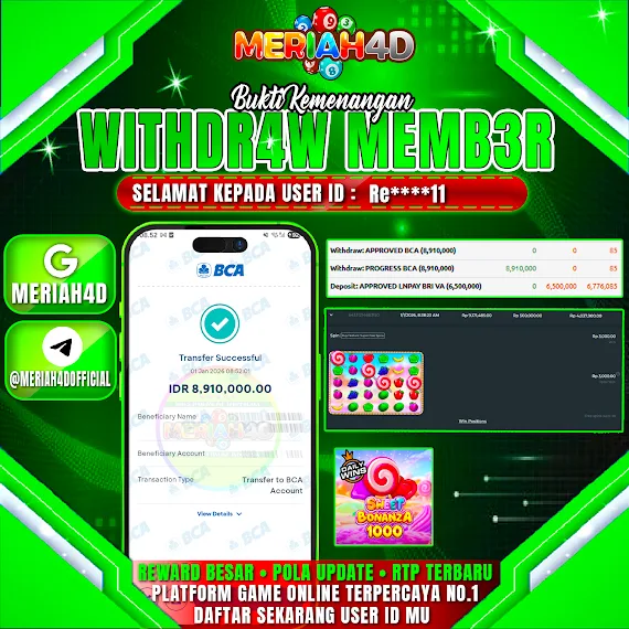 Selamat Kepada ID : RE******11 Atas Withdraw Rp. 8.910.000 Juta Hari ini. Ditunggu Withdraw Selanjutnya dan ajak juga teman temannya bergabung di Meriah4d