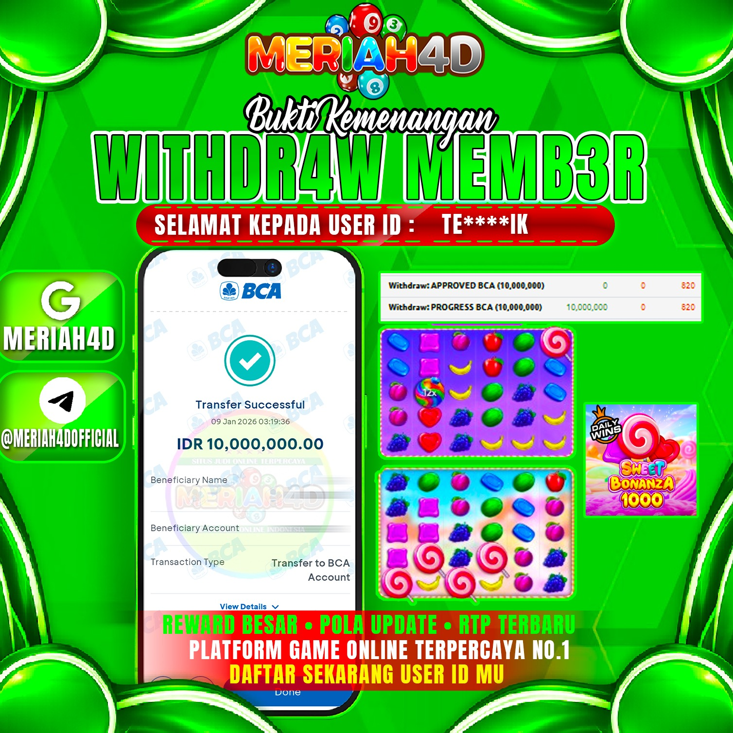Selamat Kepada ID : TE*****IK Atas Withdraw Rp. 10.000.000 Juta Hari ini. Ditunggu Withdraw Selanjutnya dan ajak juga teman temannya bergabung di Meriah4d