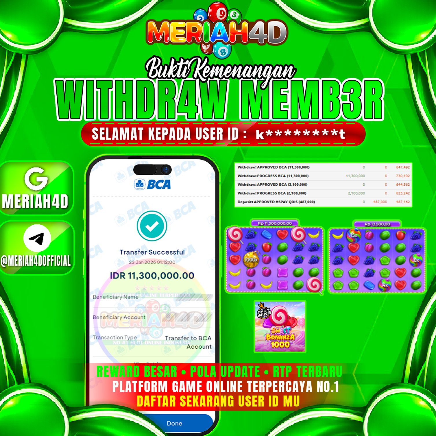 Selamat Kepada ID : K******T Atas Withdraw Rp. 11.300.000 Juta Hari ini. Ditunggu Withdraw Selanjutnya dan ajak juga teman temannya bergabung di Meriah4d