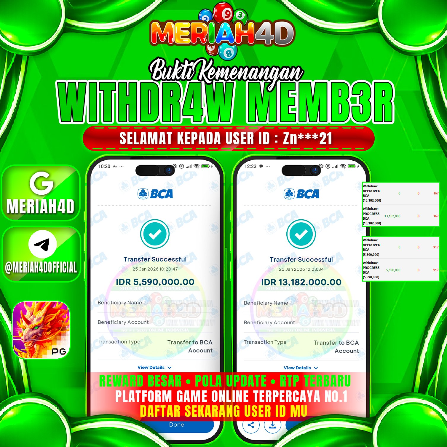 Selamat Kepada ID : ZN******21 Atas Withdraw Rp. 18.772.000 Juta Hari ini. Ditunggu Withdraw Selanjutnya dan ajak juga teman temannya bergabung di Meriah4d