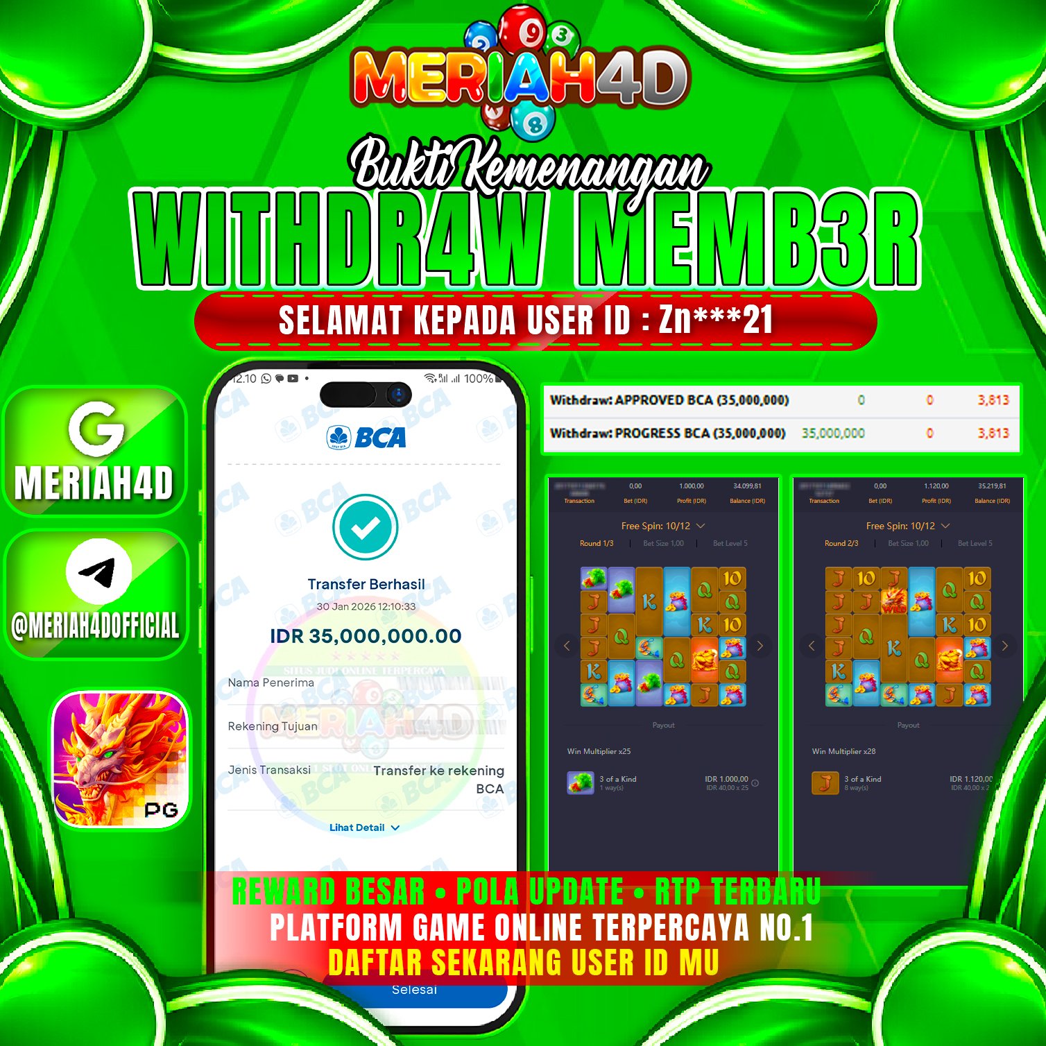 Selamat Kepada ID : ZN******21 Atas Withdraw Rp. 35.000.000 Juta Hari ini. Ditunggu Withdraw Selanjutnya dan ajak juga teman temannya bergabung di Meriah4d