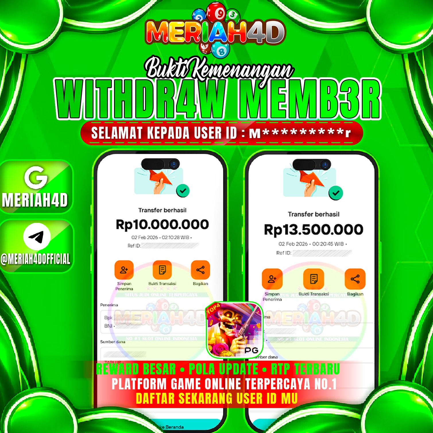 Selamat Kepada ID : M******R Atas Withdraw Rp. 23.500.000 Juta Hari ini. Ditunggu Withdraw Selanjutnya dan ajak juga teman temannya bergabung di Meriah4d
