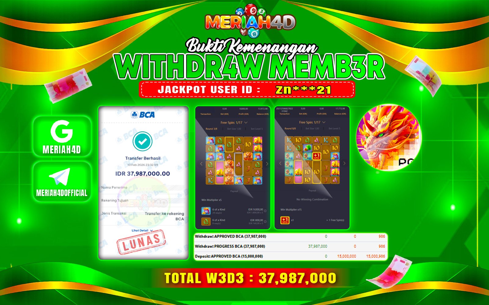 Selamat Kepada ID : ZN*****21 Atas Withdraw Rp. 37.987.000 Juta Hari ini. Ditunggu Withdraw Selanjutnya dan ajak juga teman temannya bergabung di Meriah4d