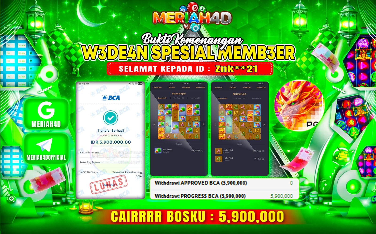 Selamat Kepada ID : ZNK**21 Atas Withdraw Rp. 5.900.000 Juta Hari ini. Ditunggu Withdraw Selanjutnya dan ajak juga teman temannya bergabung di Meriah4d