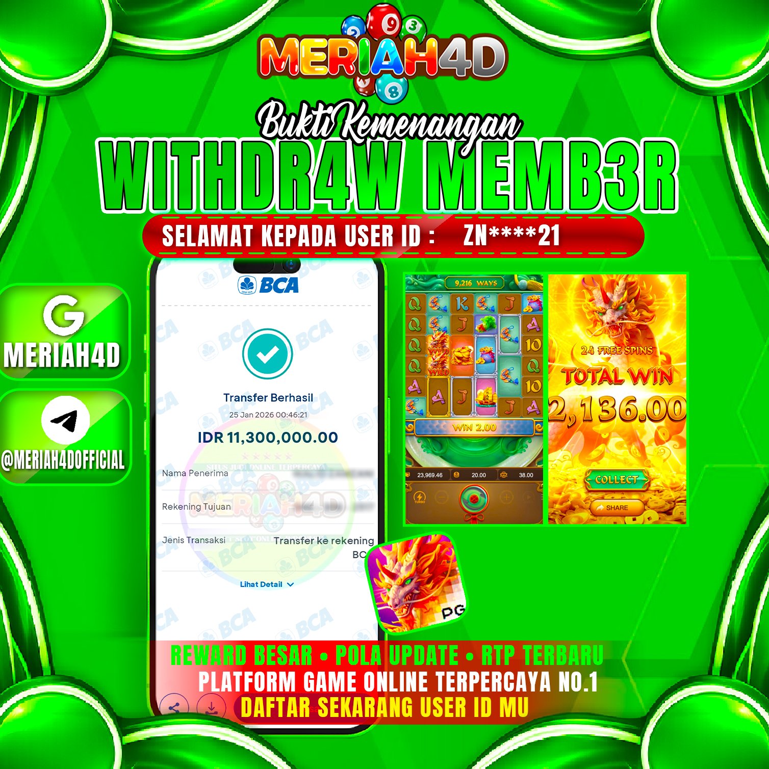 Selamat Kepada ID : ZN******21 Atas Withdraw Rp. 11.300.000 Juta Hari ini. Ditunggu Withdraw Selanjutnya dan ajak juga teman temannya bergabung di Meriah4d