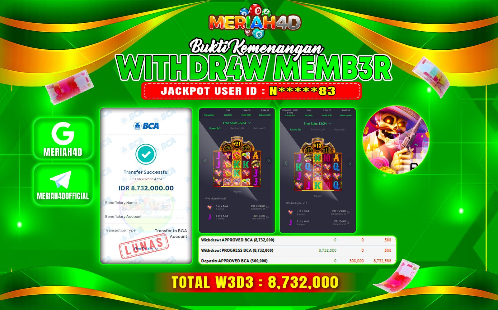 Selamat Kepada ID : N******83 Atas Withdraw Rp. 8.732.000 Juta Hari ini. Ditunggu Withdraw Selanjutnya dan ajak juga teman temannya bergabung di Meriah4d