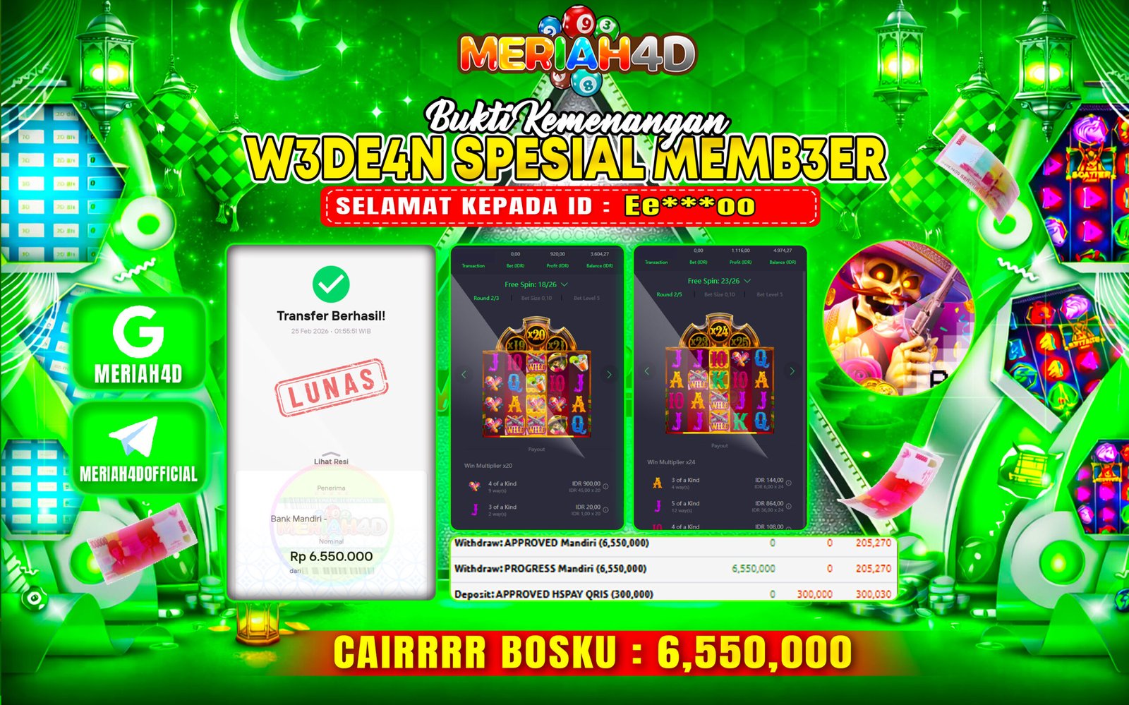 Selamat Kepada ID : EE****00 Atas Withdraw Rp. 6.550.000 Juta Hari ini. Ditunggu Withdraw Selanjutnya dan ajak juga teman temannya bergabung di Meriah4d