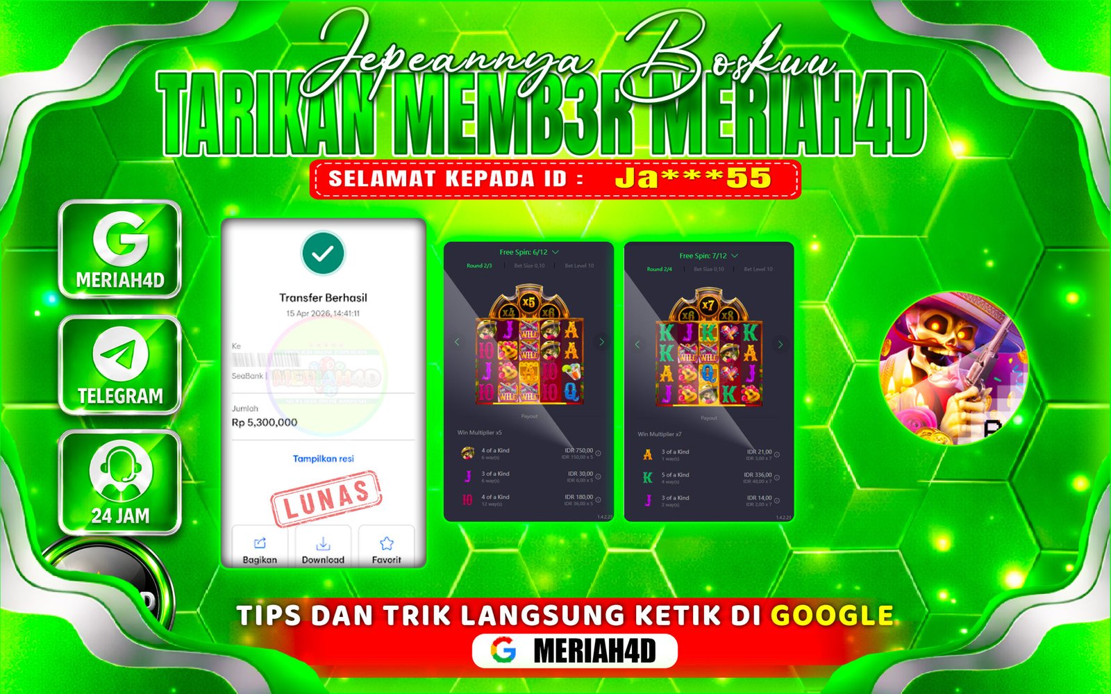 Selamat Kepada ID : Ja***55 Atas Withdraw Rp. 5.300.000 Juta Hari ini. Ditunggu Withdraw Selanjutnya dan ajak juga teman temannya bergabung di Meriah4d