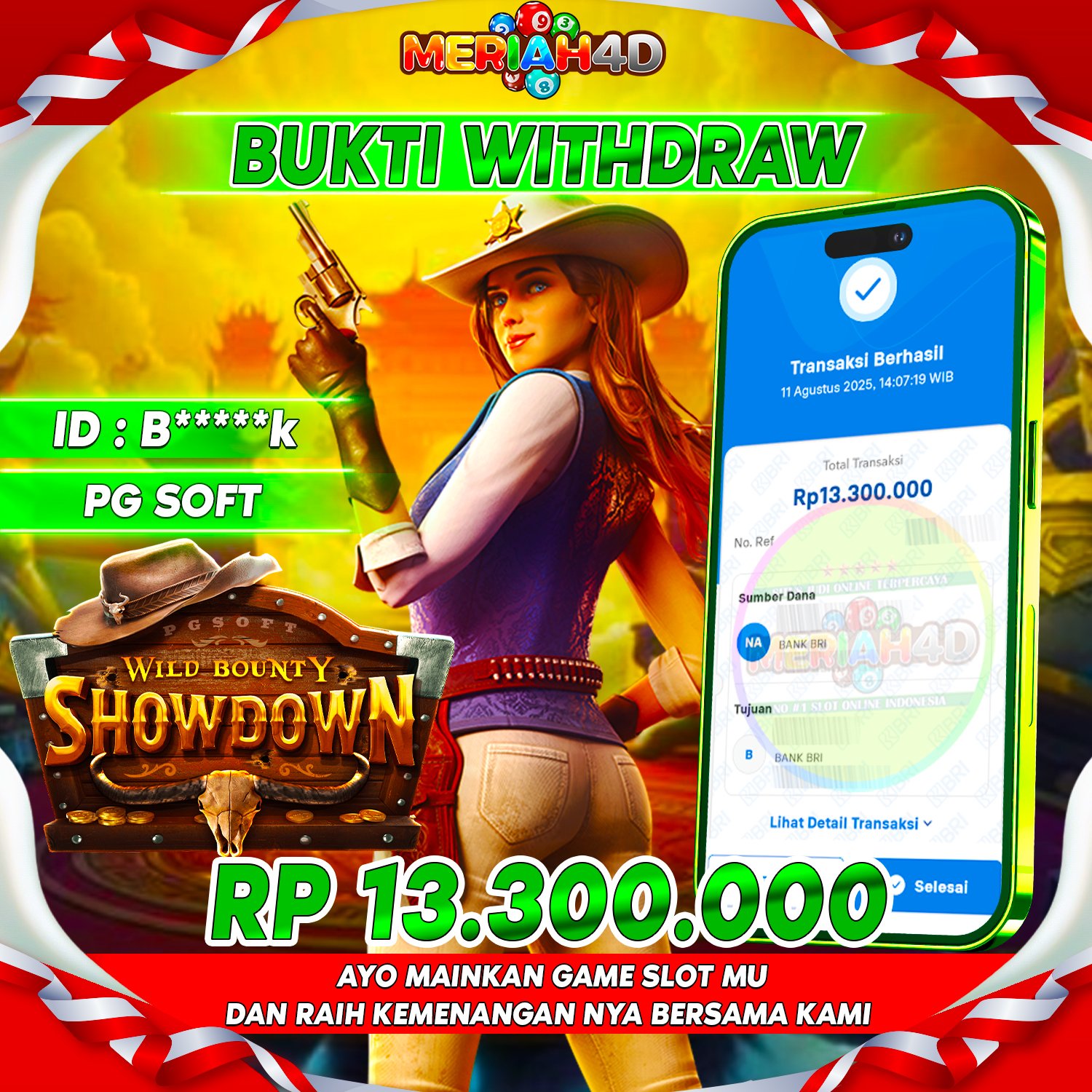 Selamat Kepada ID : B********K Atas Withdraw Rp. 13.300.000 Juta Hari ini. Ditunggu Withdraw Selanjutnya dan ajak juga teman temannya bergabung di Meriah4d