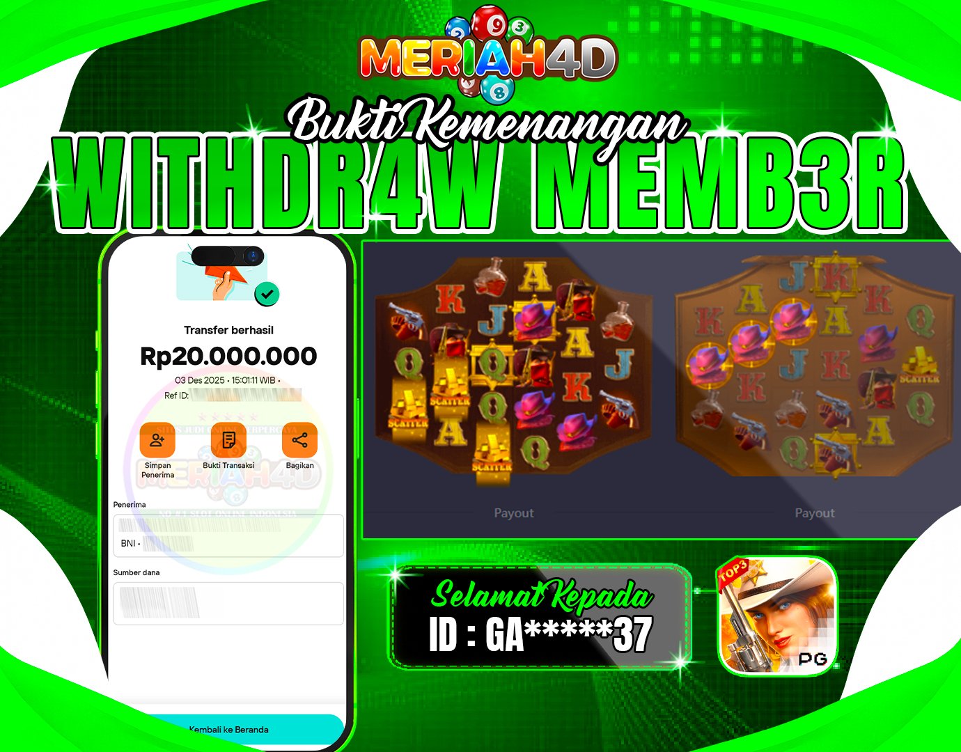 Selamat Kepada ID : GA*******37 Atas Withdraw Rp. 20.000.000 Juta Hari ini. Ditunggu Withdraw Selanjutnya dan ajak juga teman temannya bergabung di Meriah4d