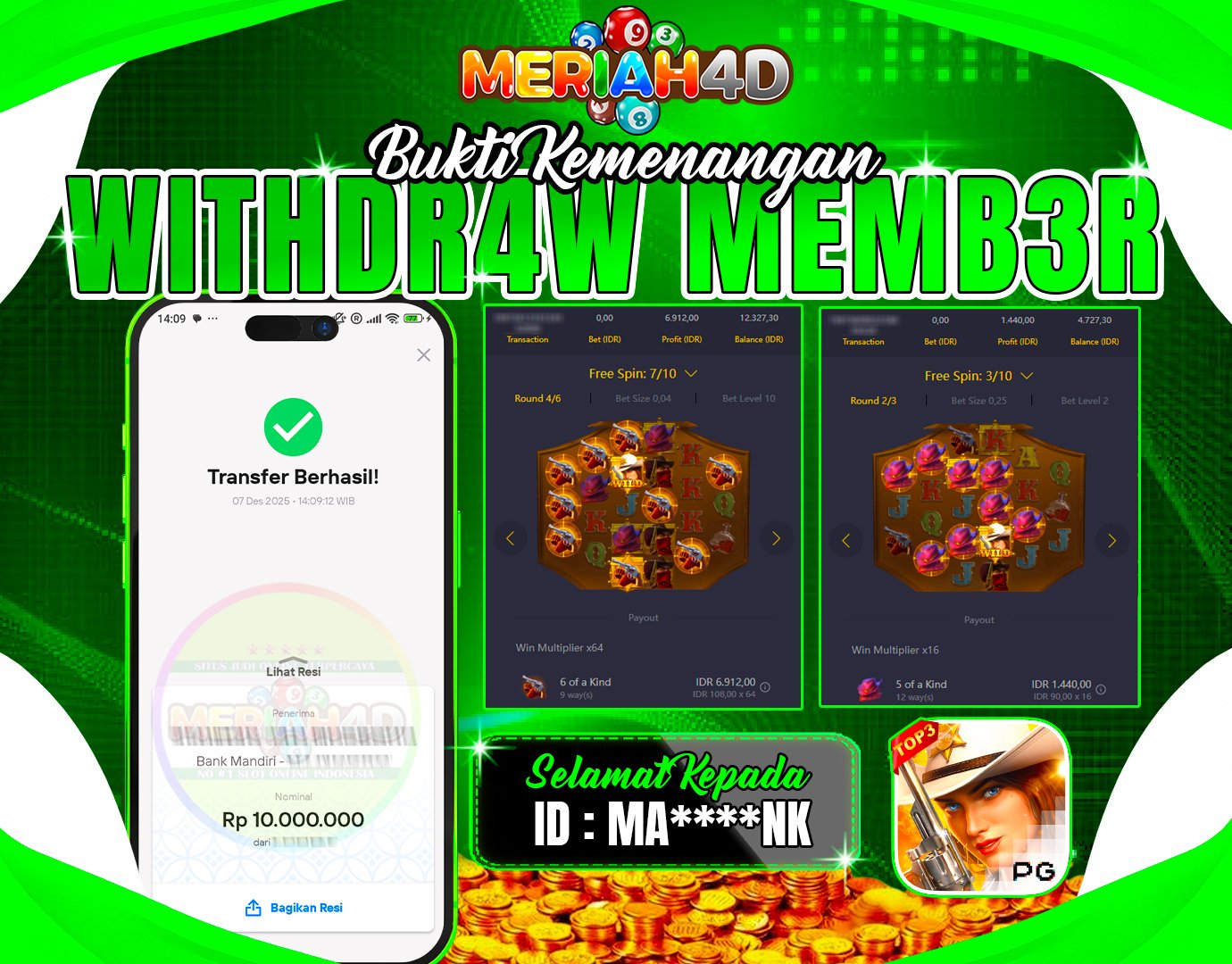 Selamat Kepada ID : MA*****NK Atas Withdraw Rp. 10.000.000 Juta Hari ini. Ditunggu Withdraw Selanjutnya dan ajak juga teman temannya bergabung di Meriah4d