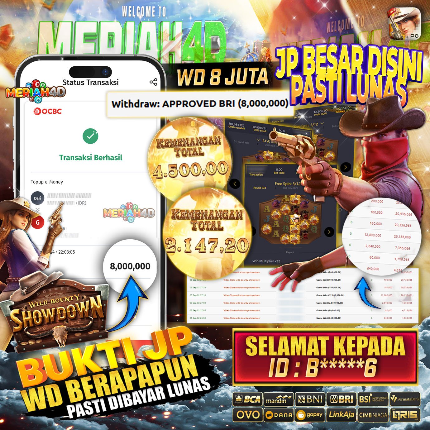 Selamat Kepada Id : B******6 Atas Withdraw Rp. 8.000.000 Juta Hari ini. Ditunggu Withdraw Selanjutnya dan ajak juga teman temannya bergabung di Meriah4d