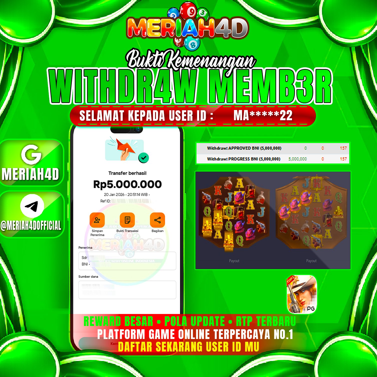 Selamat Kepada ID : MA******22 Atas Withdraw Rp. 5.000.000 Juta Hari ini. Ditunggu Withdraw Selanjutnya dan ajak juga teman temannya bergabung di Meriah4d