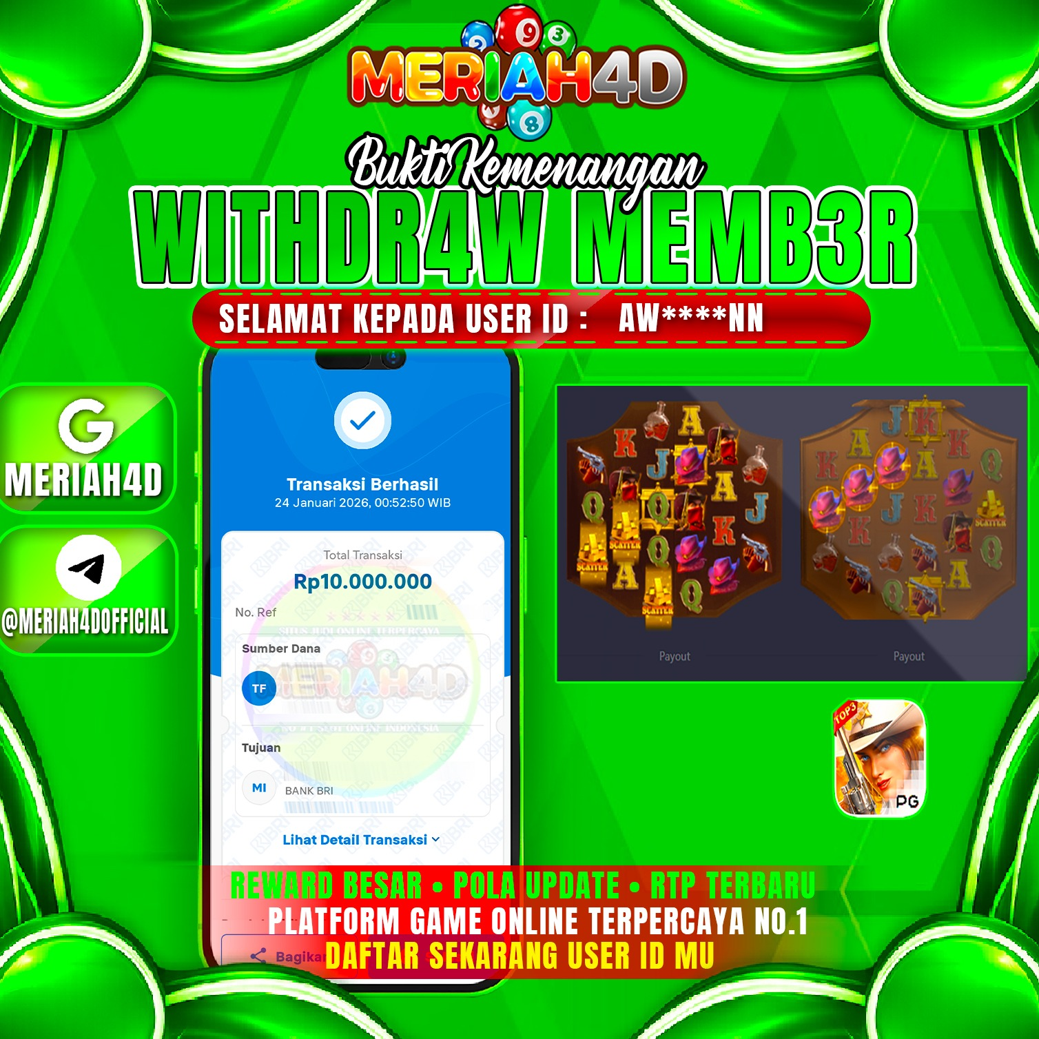 Selamat Kepada ID : AW*****NN Atas Withdraw Rp. 10.000.000 Juta Hari ini. Ditunggu Withdraw Selanjutnya dan ajak juga teman temannya bergabung di Meriah4d