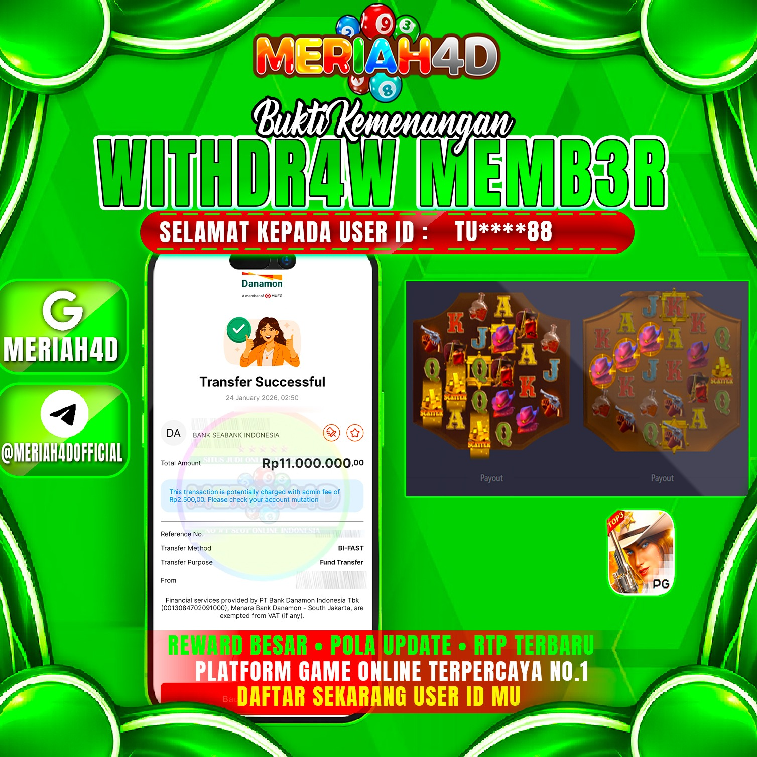 Selamat Kepada ID : TU*****88 Atas Withdraw Rp. 11.000.000 Juta Hari ini. Ditunggu Withdraw Selanjutnya dan ajak juga teman temannya bergabung di Meriah4d