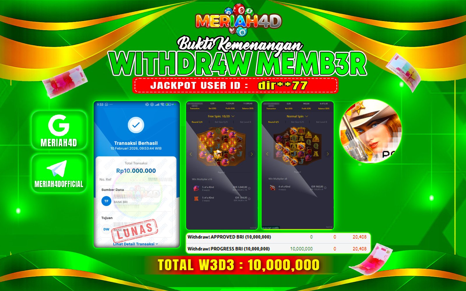 Selamat Kepada ID :DIR**77 Atas Withdraw Rp. 10.000.000 Juta Hari ini. Ditunggu Withdraw Selanjutnya dan ajak juga teman temannya bergabung di Meriah4d