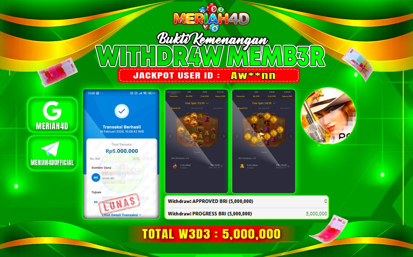 Selamat Kepada ID : AW**NN Atas Withdraw Rp. 5.000.000 Juta Hari ini. Ditunggu Withdraw Selanjutnya dan ajak juga teman temannya bergabung di Meriah4d