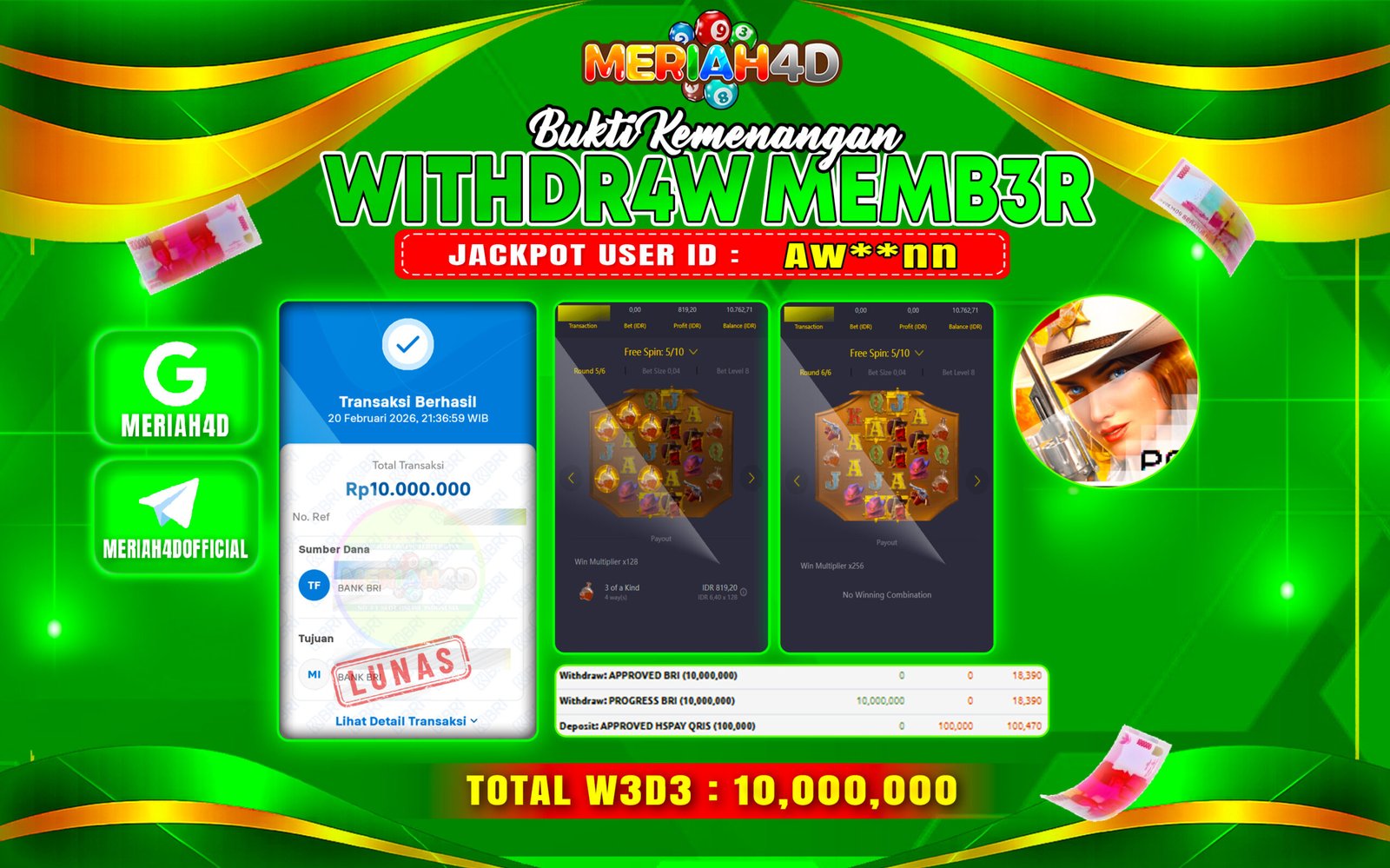 Selamat Kepada ID : AW****NN Atas Withdraw Rp. 10.000.000 Juta Hari ini. Ditunggu Withdraw Selanjutnya dan ajak juga teman temannya bergabung di Meriah4d