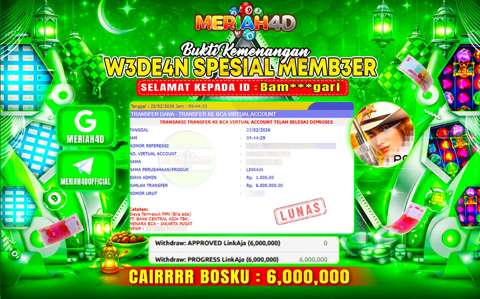 Selamat Kepada ID : BAM***GARI Atas Withdraw Rp. 6.000.000 Juta Hari ini. Ditunggu Withdraw Selanjutnya dan ajak juga teman temannya bergabung di Meriah4d