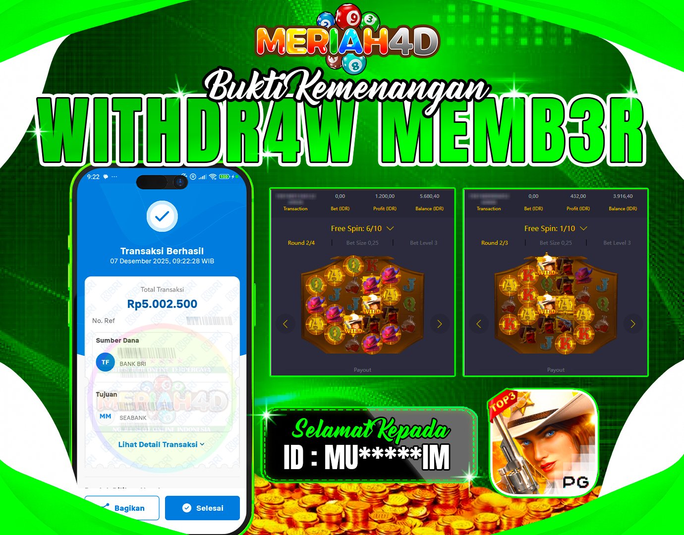 Selamat Kepada ID : MU*****IM Atas Withdraw Rp. 5.000.000 Juta Hari ini. Ditunggu Withdraw Selanjutnya dan ajak juga teman temannya bergabung di Meriah4d