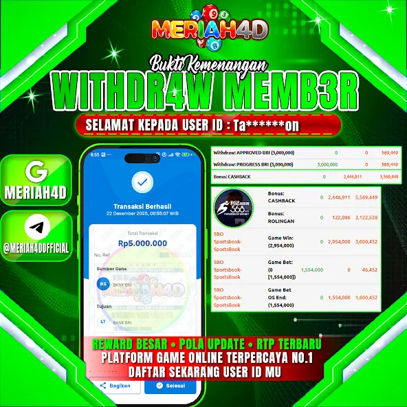Selamat Kepada ID : TA******ON Atas Withdraw Rp. 5.000.000 Juta Hari ini. Ditunggu Withdraw Selanjutnya dan ajak juga teman temannya bergabung di Meriah4d