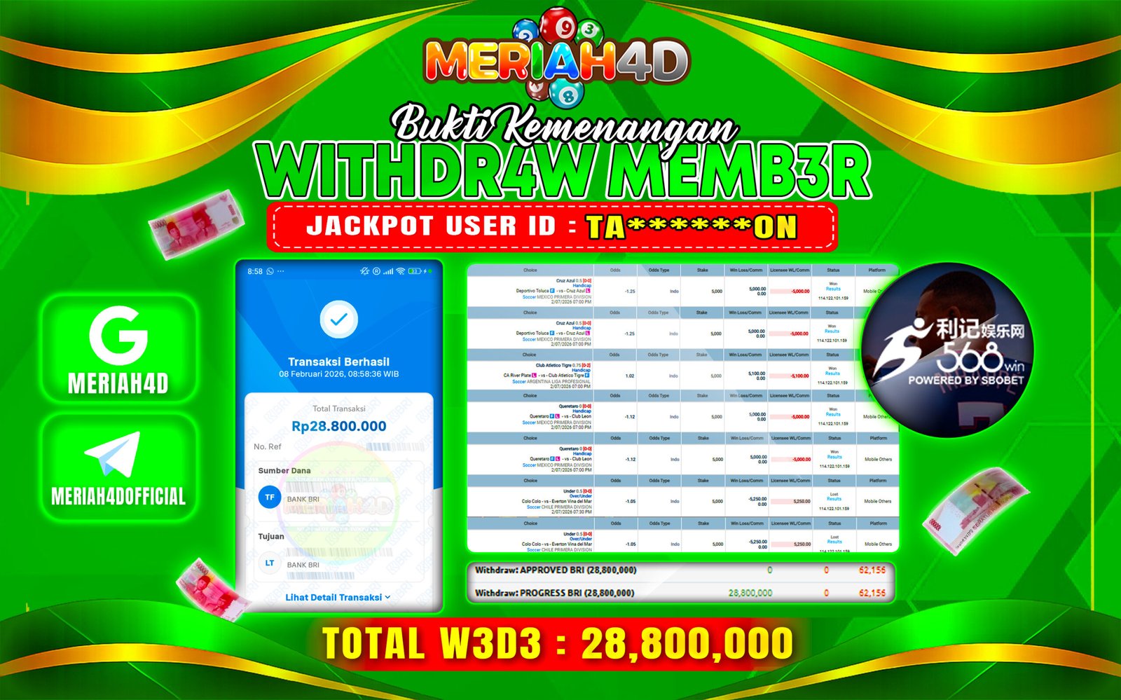 Selamat Kepada ID : TA******ON Atas Withdraw Rp. 28.800.000 Juta Hari ini. Ditunggu Withdraw Selanjutnya dan ajak juga teman temannya bergabung di Meriah4d
