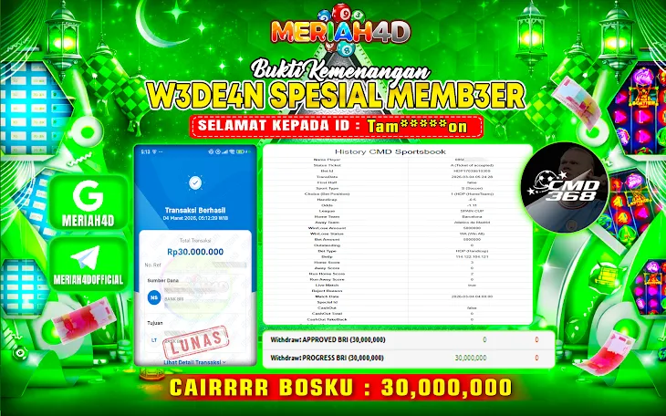 Selamat Kepada ID : TAM*****ON Atas Withdraw Rp. 30.000.000 Juta Hari ini. Ditunggu Withdraw Selanjutnya dan ajak juga teman temannya bergabung di Meriah4d