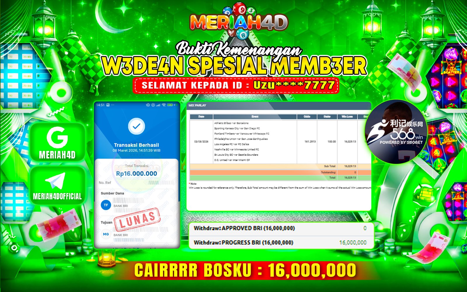 Selamat Kepada ID : UZU****7777 Atas Withdraw Rp. 16.000.000 Juta Hari ini. Ditunggu Withdraw Selanjutnya dan ajak juga teman temannya bergabung di Meriah4d