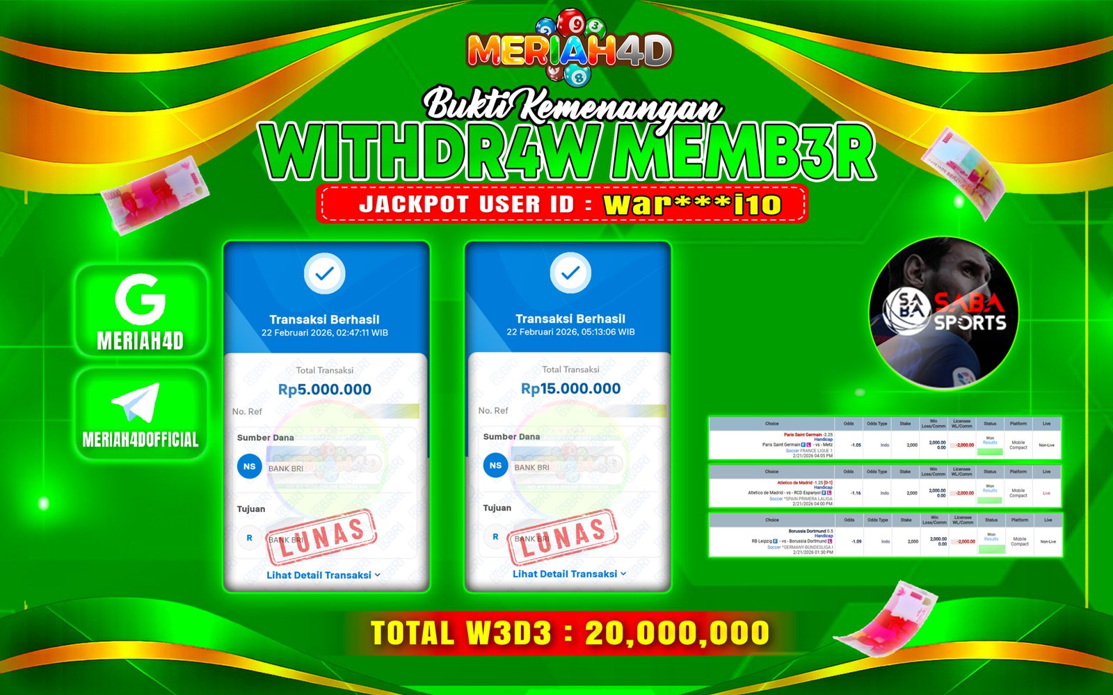 Selamat Kepada ID : WAR****I10 Atas Withdraw Rp. 20.000.000 Juta Hari ini. Ditunggu Withdraw Selanjutnya dan ajak juga teman temannya bergabung di Meriah4d
