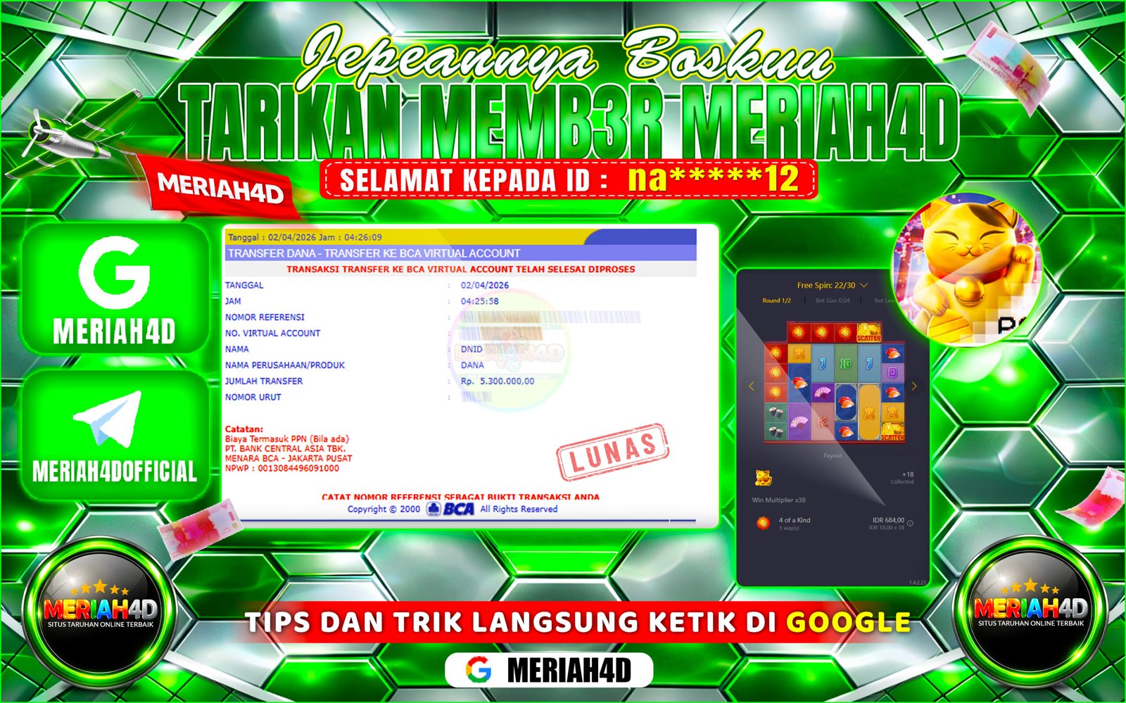 Selamat Kepada ID : MI*****75 Atas Withdraw Rp. 5.500.000 Juta Hari ini. Ditunggu Withdraw Selanjutnya dan ajak juga teman temannya…