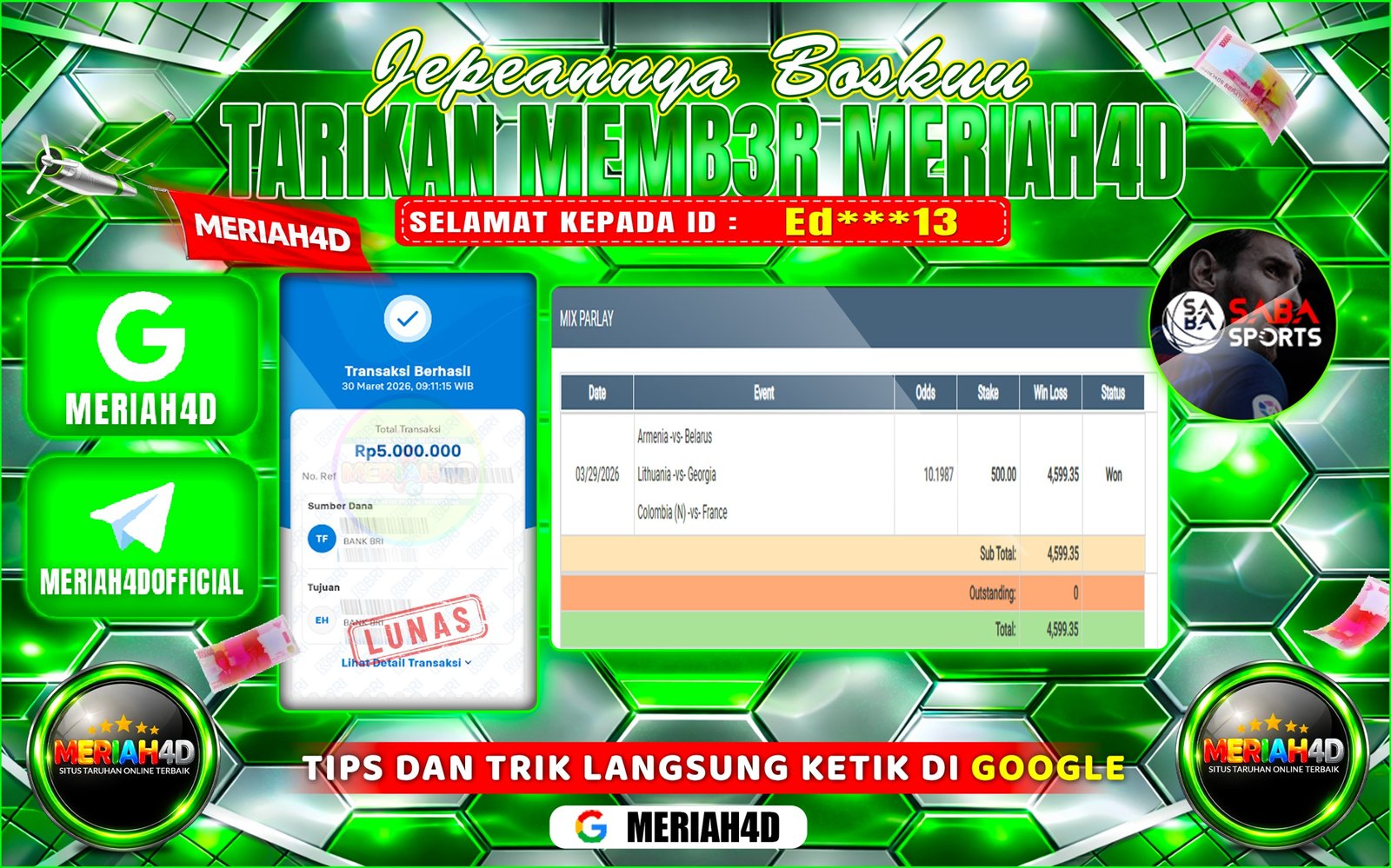 Selamat Kepada ID : S******58 Atas Withdraw Rp. 15.000.000 Juta Hari ini. Ditunggu Withdraw Selanjutnya dan ajak juga teman temannya…
