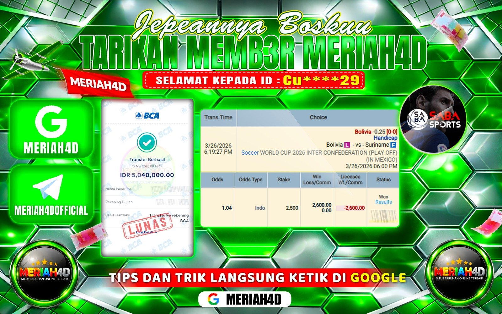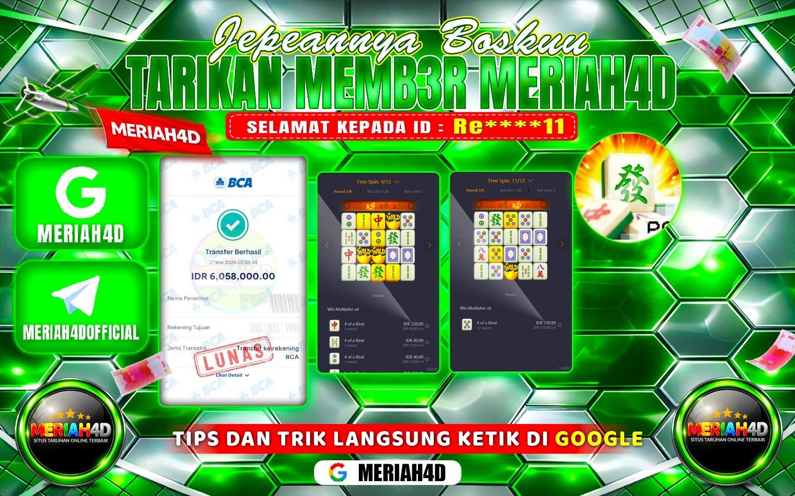 Selamat Kepada ID : Ve*****23 Atas Withdraw Rp. 60,300,000 Juta Hari ini. Ditunggu Withdraw Selanjutnya dan ajak juga teman temannya…