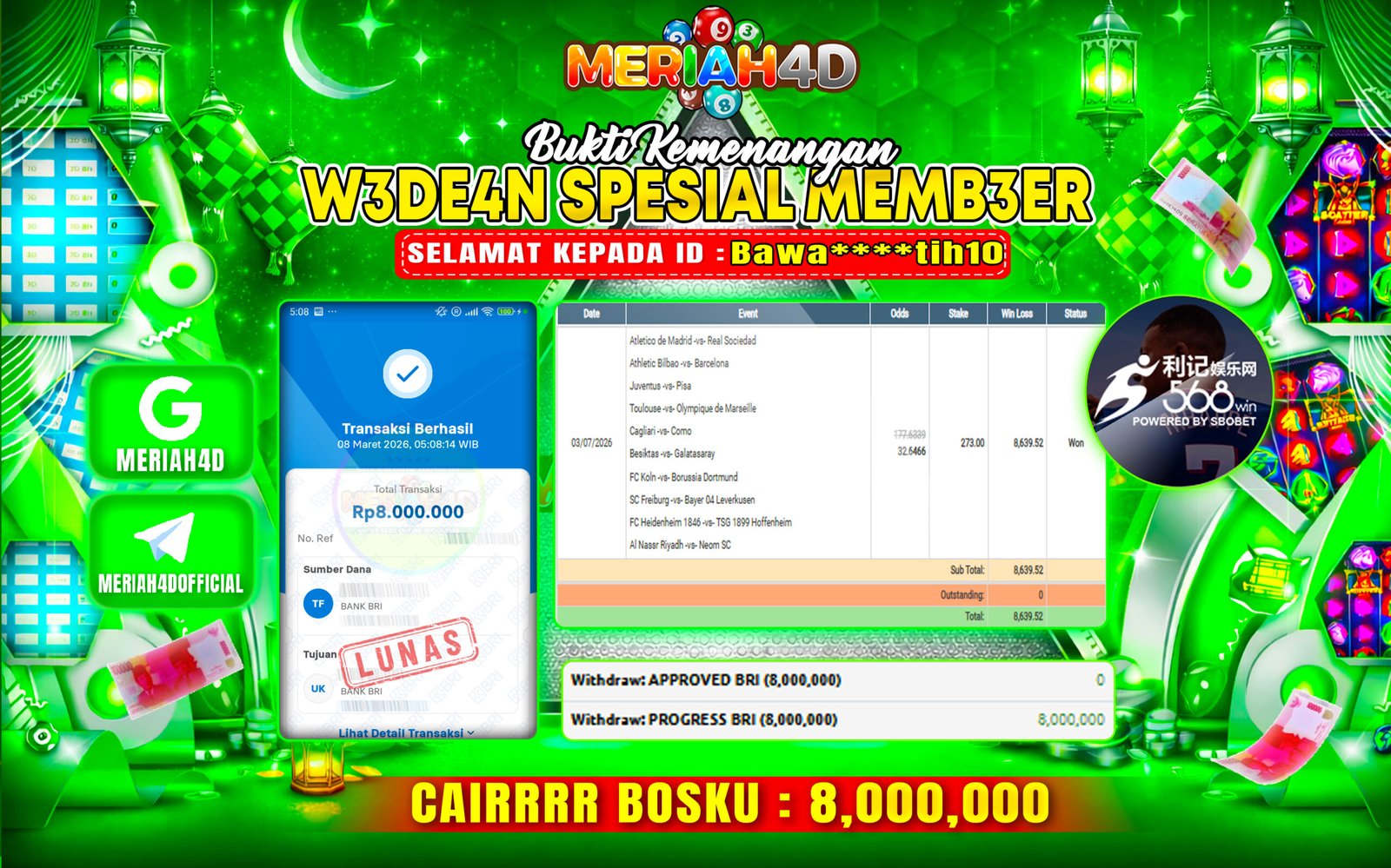 Selamat Kepada Id : N******04 Atas Withdraw Rp. 8.000.000 Juta Hari ini. Ditunggu Withdraw Selanjutnya dan ajak juga teman temannya…